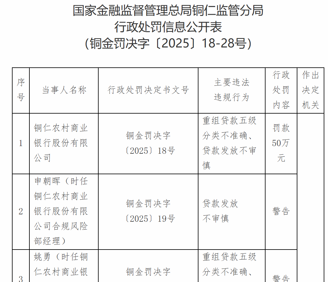 12月16日,国家金融监督管理总局铜仁监管分局行政处罚信息公开表显示,铜仁农村商业银行股份有限公司因重组贷款五级分类不准确、贷款发放不审慎被罚款50万元;申某晖、姚某、马某、杨某翠、陈某红、蒋某高、罗某强、杨某东被警告;蒋某丽被禁止终身从事银行业工作;王某森被禁止6年从事银行业工作。